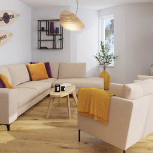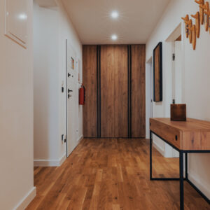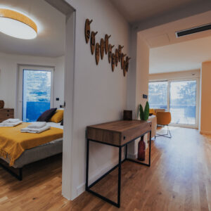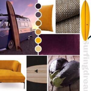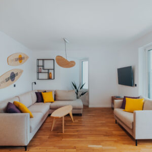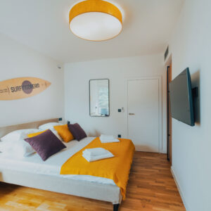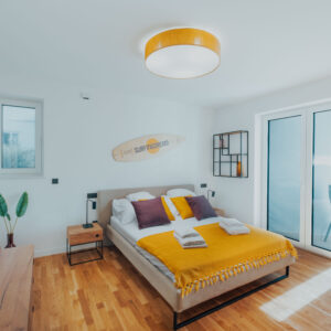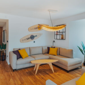 Apartament umiejscowiony jest w Chorwacji w kurorcie Novalja a jednym z elementów nawiązującym do surfingu są lampy w salonie i jadalni, zaprojektowane przez Tomka Andrzeja Rudkiewicza. Kolorystyka mebli nawiązuje do jasnej sklejki, lecz osadzona w nowoczesnej czarnej kolorystyce ram i wykończeń. Śródziemnomorski klimat podkreśla słoneczna stylizacja kontrastującą z elementami w barwach oberżyny.