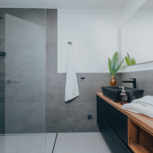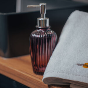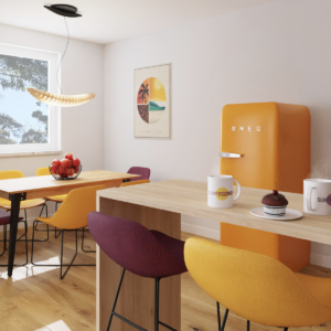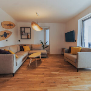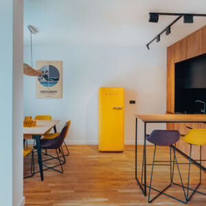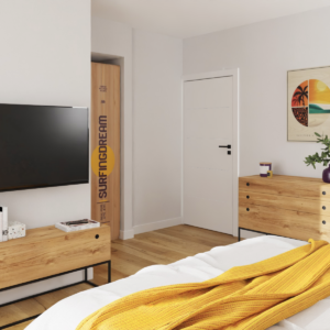 Materiał wykończeniowy mebli miękkich to wysokiej jakości, odporna na zabrudzenia i tarcie tkanina, używana w obiektach hotelowych. Fotele, hookery MISHELL projektu Piotra Kuchcińskiego, marki NOTI, wykończone zostały tkaniną Main Line Flax 17 i 40 FARGOTEX. Komody, szafki nocne, RTV-ki i konsola pochodzą od Maxliving. Kuchnia zaprojektowana tak aby wakacyjny pobyt dawał komfort jej użytkowania i nie przykuwał koniecznością w niej przebywania. Vintage lodówka SMEG to jedyne miejsce gdzie trzeba wracać, bo tam chłodziarka skrywa zawsze coś dobrego dla surferów…