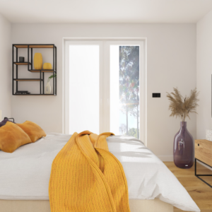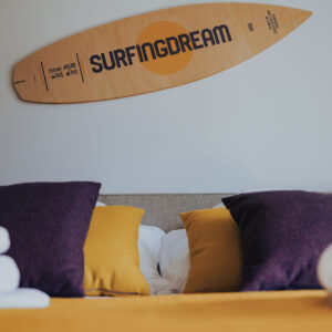 Sypialnie w łóżkami Hygee marki Maxliving w rozmiarze kingsize wygodnie utulą do snu po dniu i nocy pełnej przygód. Całość dopełniają stylizowane surfingowe detale ze studia SznurWiór.